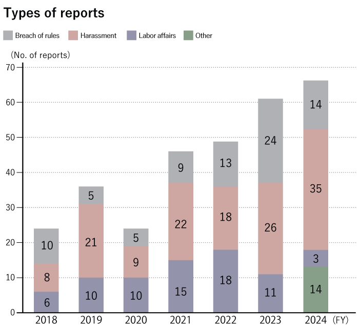 The Group has established a whistleblowing system that enables all officers and employees as well as all individuals working at the Group (including part-timers and employees seconded from business partners) to notify the Compliance Committee directly with respect to compliance-related issues including human rights abuses and corruption in the Group, and to seek corrective action. The Company has set up points of contact for whistleblowers both internally and outside the Group (a corporate lawyer).The Group’s internal company rules rigorously provide for the whistleblowing system in terms of protecting the confidentiality of whistleblowers and prohibiting any disadvantageous treatment of any whistleblower in accordance with the Whistle-Blower Protection Act.